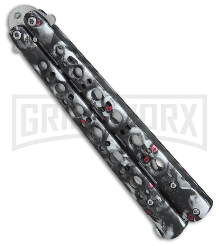 This Skull Fly Butterfly Trainer has a stainless steel handle with a gray skull camo finish and a satin finished trainer blade.