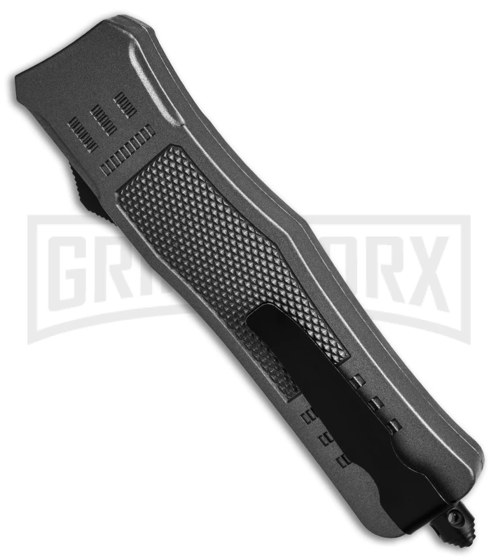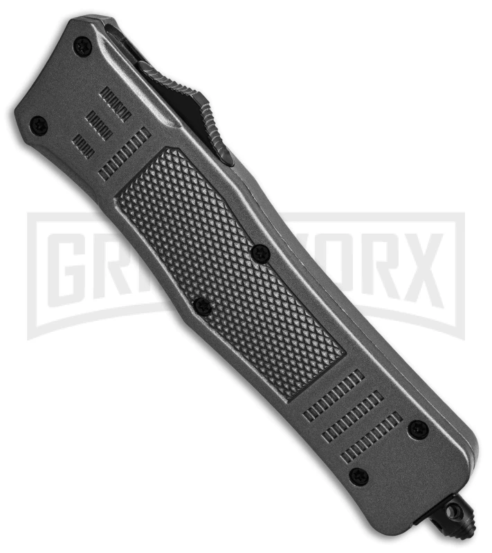 This Atomic OTF model has a gray handle and a two-tone finished dagger blade with partially serrated edges.