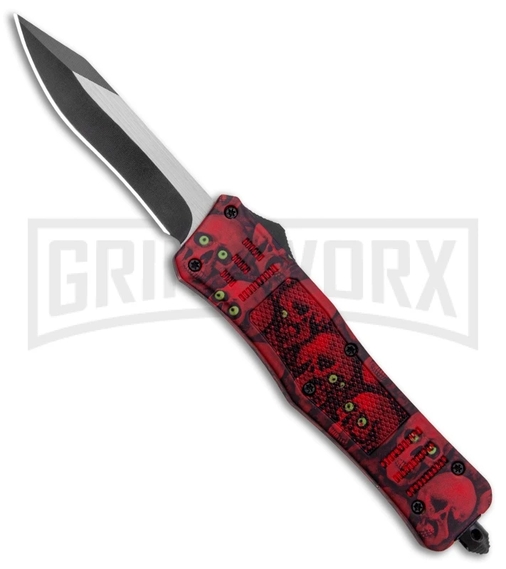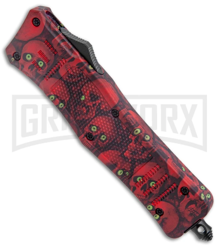 This Atomic Dagger OTF model has a red skull camo handle and a black and satin finished recurve blade with a plain edge.