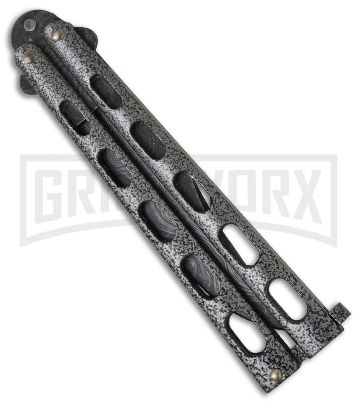 Bear & Son Cutlery Knives present the 5″ Silver Vein Butterfly Knife with a Damascus-finished blade with a single tang pin. This knife features a tough silver vein epoxy powder coated handle, which is textured silver paint over a black base. The handles feature a skeletonized design to reduce weight. This is a great butterfly knife at a great price and made right here in the USA.