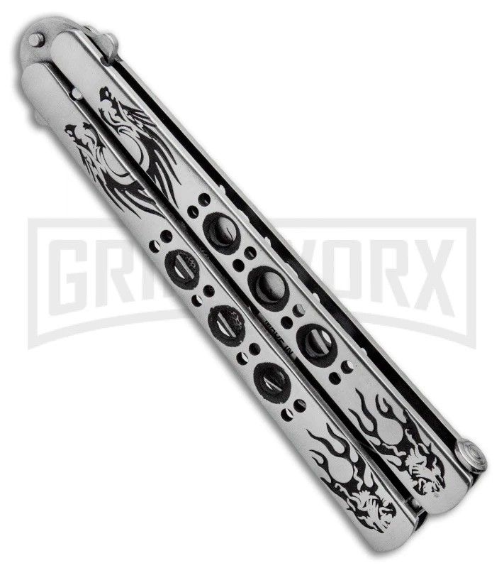 Enter the Dragon…dragon butterfly knife, that is! This excellent budget butterfly knife features a black dragon and flame engraved handle with a dragon engraved on the blade. It has a dual tang-pin design and features a metal latch to secure the knife open or closed.