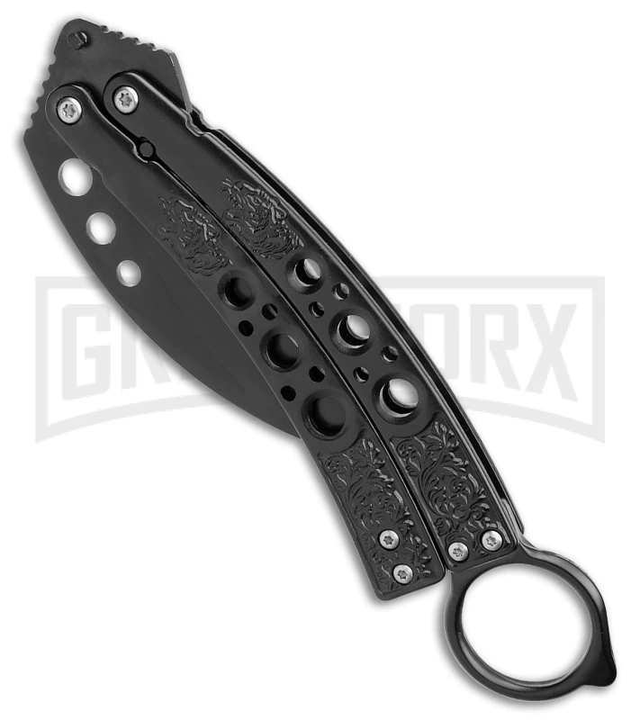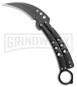 This Karambit Tactical balisong is built with a black-finished blade and black handles.