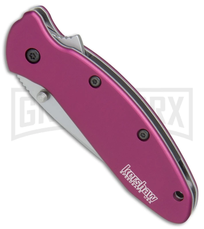 The Kershaw Scallion is about 20% larger than the Chive and perfect for just about anything! The light and strong purple anodized 6061-T6 aluminum handles are fastened to a steel liner lock frame. The bead blast finished 420HC blade has a plain edge. This SpeedSafe assisted knife features dual thumb studs and a flipper for easy one-handed operation.