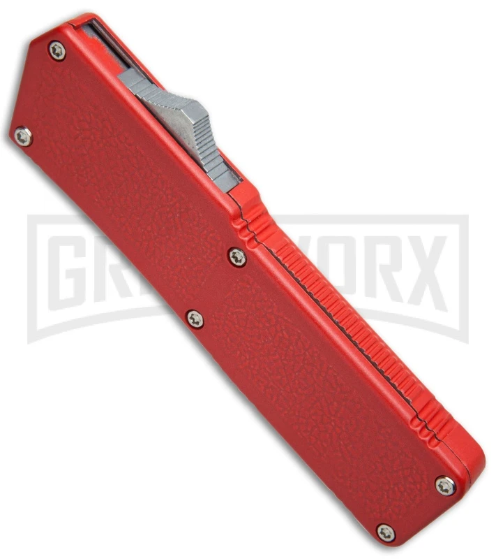 This Lightning OTF model has a double edge dagger blade with a partially serrated edge. The red coated aluminum handle provides a textured surface to facilitate good grip. Its firing button is mounted on the side, making the Lightning slim and easy to carry. The blade is made from satin finished stainless steel.