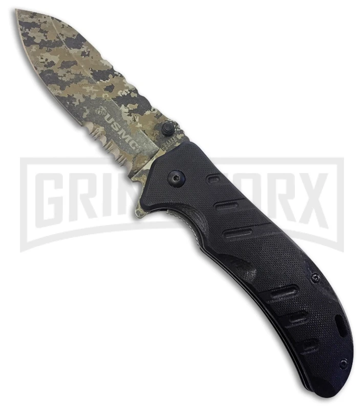 M-Tech USMC Marines Raider Black G-10 Spring Assisted Knife – Green Camo Serr