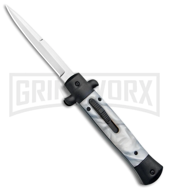 This Mago OTF model features a satin finished bayonet blade and an acrylic white marble handle with black bolsters.