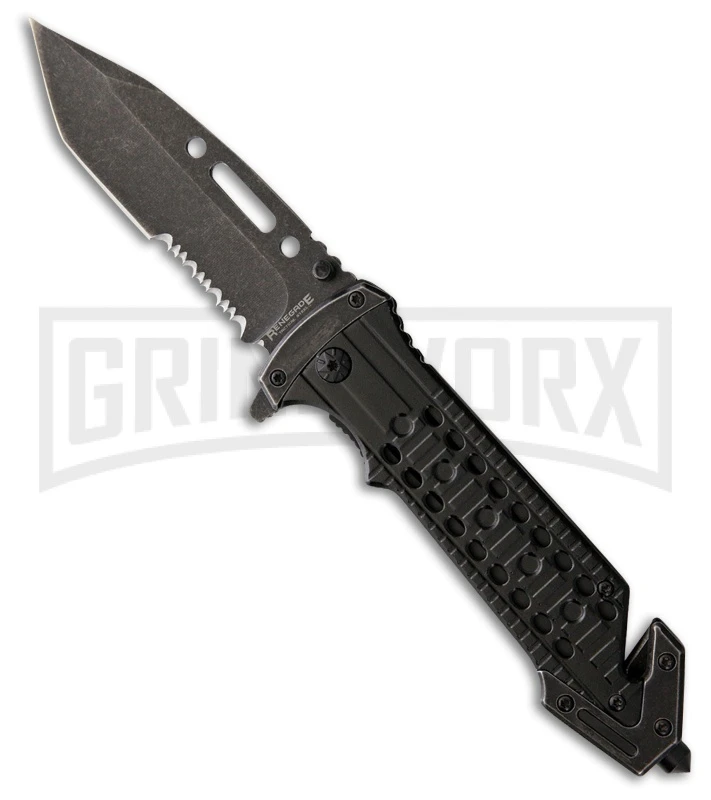 The Renegade Tactical Steel Steam Punk is a spring assisted knife for rescue situations. The stainless steel, tanto blade has a black stonewash finish, a partially serrated edge, and thumb stud and flipper openers. The handle is made of black aluminum that features a glass breaker, a seat belt cutter, and a liner lock mechanism. It comes with a stainless steel pocket clip.