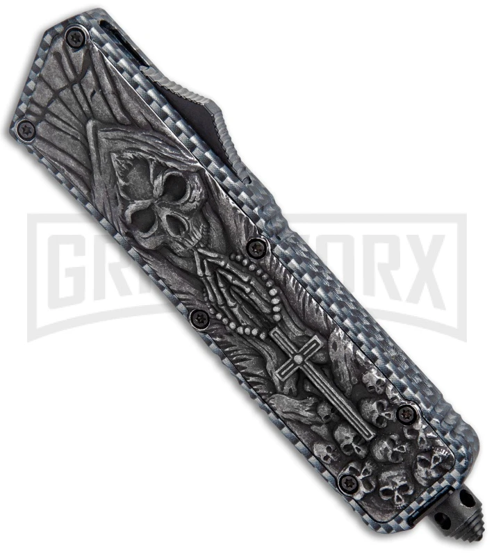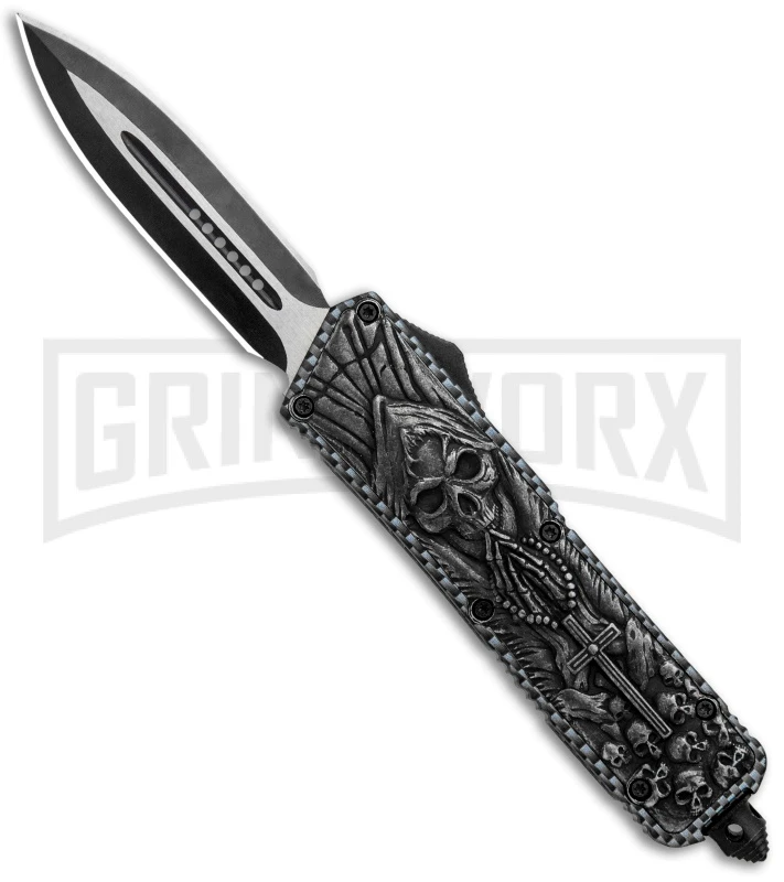 The Rumble is a budget double-action OTF knife with performance you’re sure to enjoy. This automatic knife fires open and closes with the slide of the firing button. The Rumble has a steel, skull molded body with a carbon fiber print back and includes a glass breaker tip and pocket clip. The stainless steel dagger blade on this knife is black and satin finished with plain double edges.
