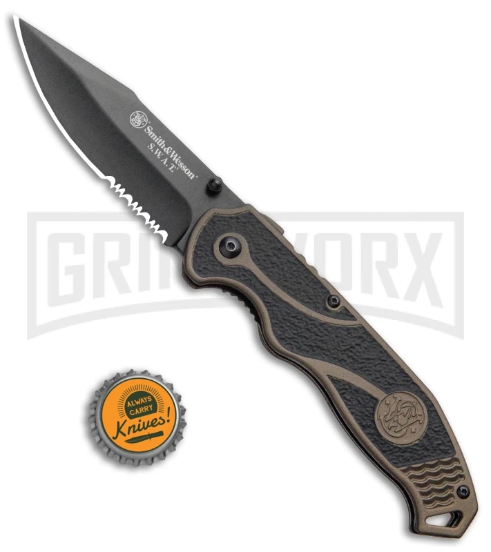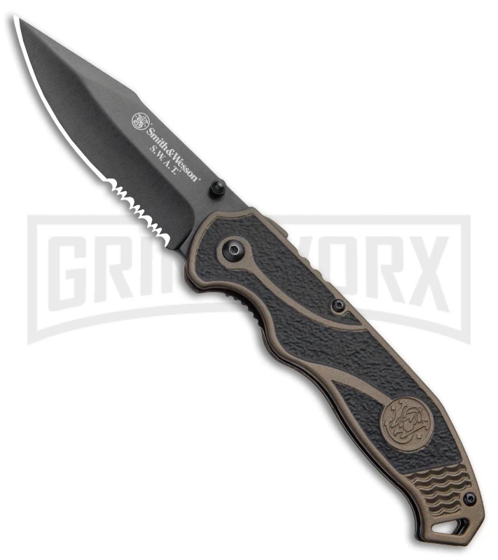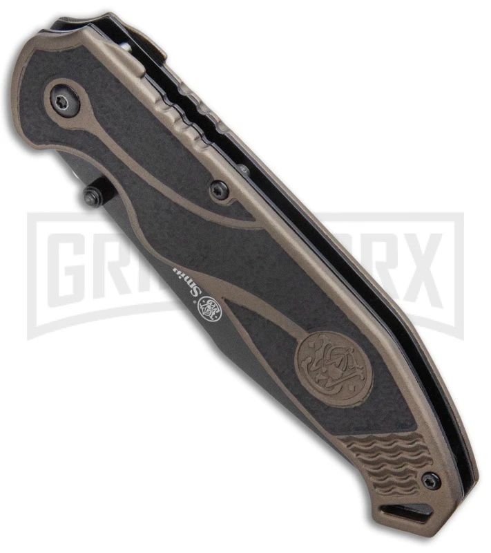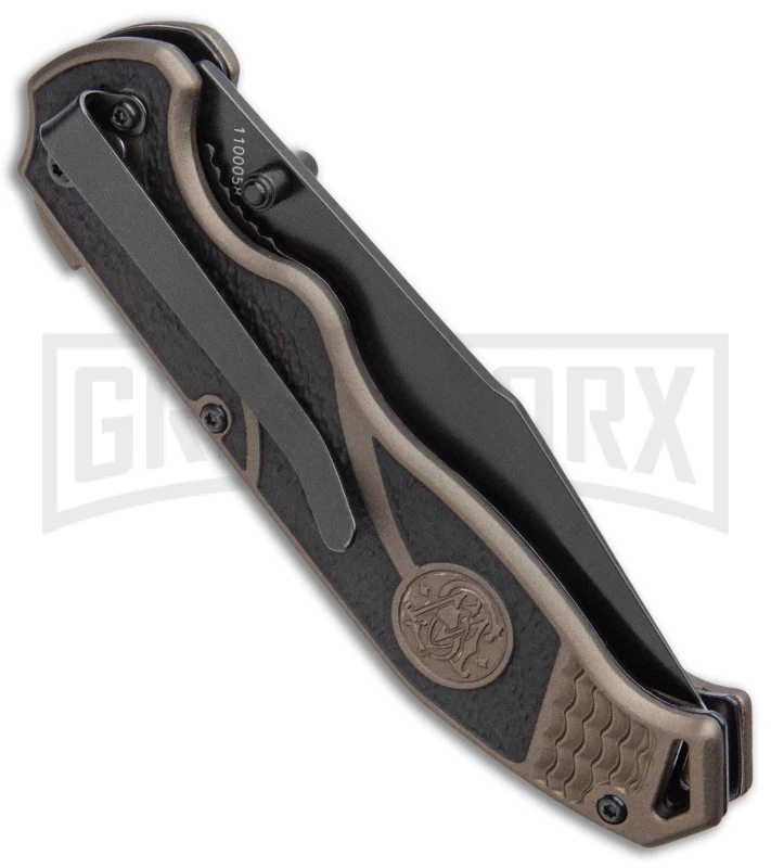 This Smith and Wesson Spring assisted knife has a bronze colored handle with black rubberized inlays for secure and reliable grip. The black coated clip point partially serrated blade is spring assisted and opened by dual thumb studs. This knife makes an excellent tactical folder or everyday carry.