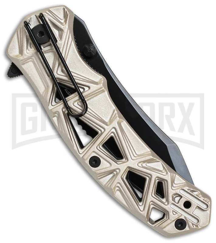 The Shizzle from Schrade is a MAGIC assisted opening knife with quick blade deployment using the flipper or thumb studs, and comes equipped with a sliding lock for secure carry and storage. This model has a black finished, partially serrated AUS-8 stainless steel blade. Its champagne skeletonized aluminum scales provide a lightweight build for everyday carry convenience. Includes a four-way reversible deep carry wire pocket clip.