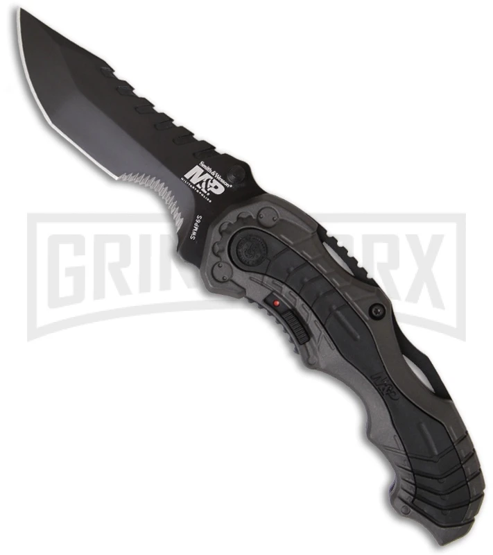 The SWMP6S model features a slate gray colored aluminum handle with black rubber inserts. The 4034 stainless steel blade is black finished with a partially serrated edge. Includes safety and tip-up carry pocket clip.