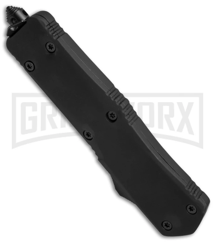 The Spartan OTF auto offers heavy duty construction and a tactical design. This affordable automatic has the feel of a much more expensive knife, with rubberized handles, a side mounted firing button, and a stainless steel dagger blade. The handle is outfitted with a tip-down pocket clip and a glass breaker. This spartan model has a two-tone dagger blade with plain edges.