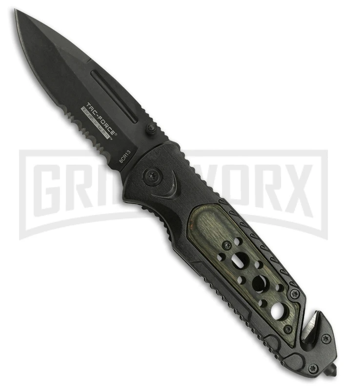 The Tac-Force Evolution Transmit is a spring assisted knife for rescue situations. The 8Cr13MoV stainless steel, spear point blade has a black finish, a partially serrated edge, and a thumb stud opener. The handle is made of black aluminum with a black pakkawood onlay that features a seat belt cutter, glass breaker, and a liner lock mechanism. It comes with a stainless steel pocket clip.